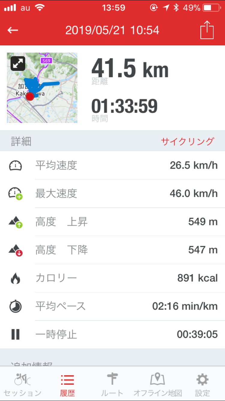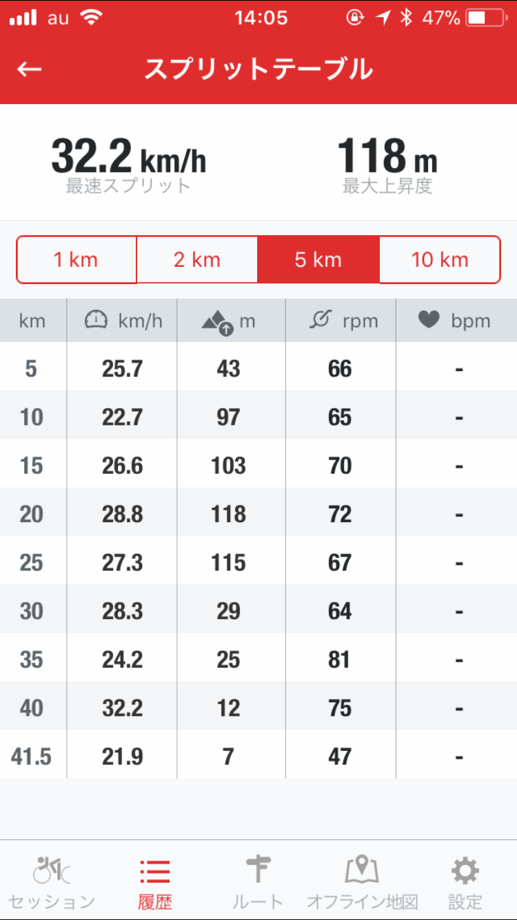 さて、管理人の走力ですが、参考までに本日の走行ログを以下に貼ります(1人練)。